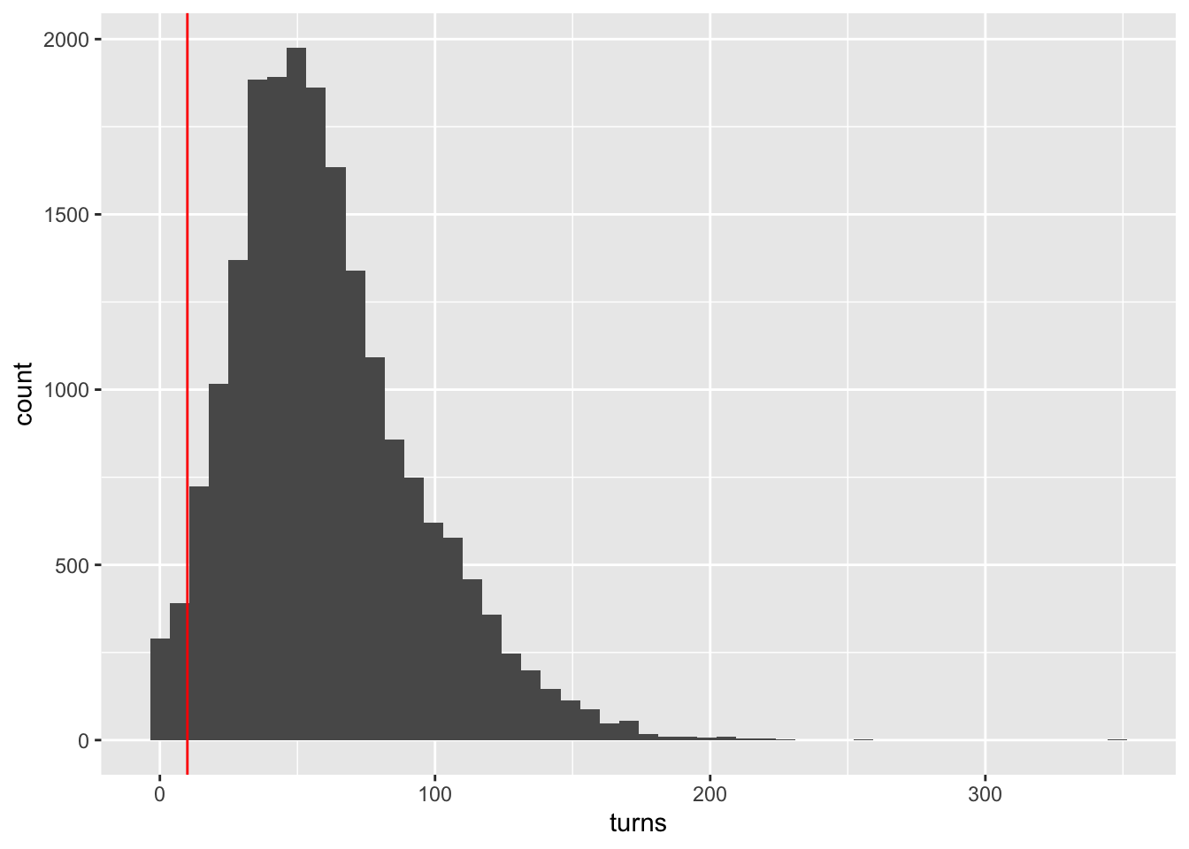 As the plot shows, the majority of the games have turns over 10 so that we just directly deleted games whose number of turns are under 10.