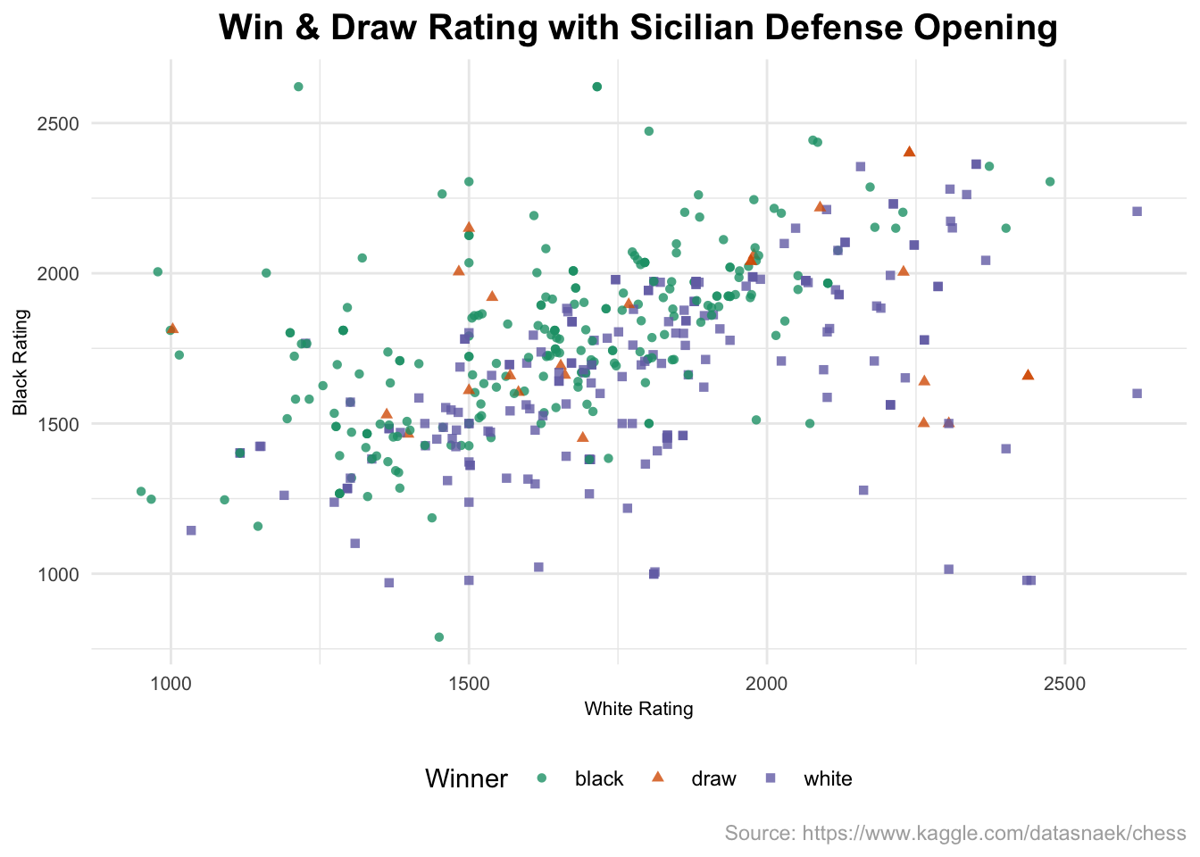 Besides, the scatterplot indicated that both Black or White high rating players had experience against the Sicilian Defense. When against higher rating players, lower rating players normally lost even though they played the Sicilian Defense.